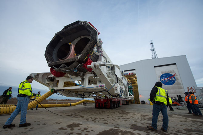 Ракету вывозят из монтажно-испытательного комплекса и транспортируют на стартовую космодрома на острове Уоллопс в США, 5 января 2014.