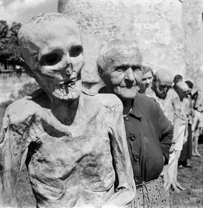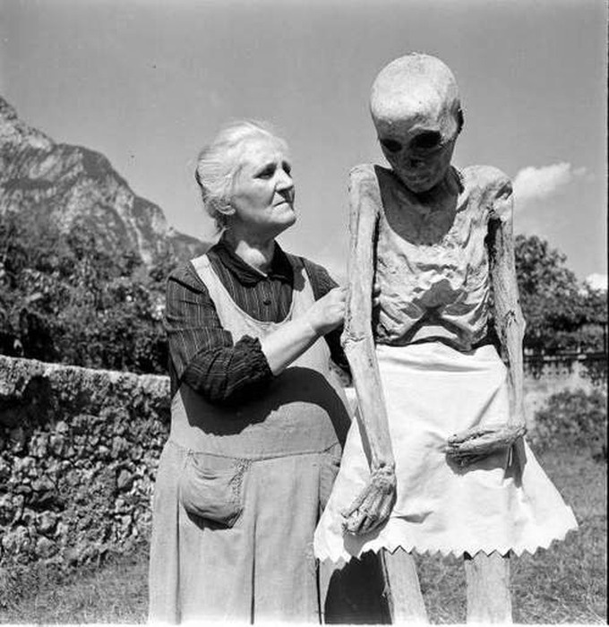 Эти снимки были сделаны в итальянской деревне Венцоне в 1950-м году. На них изображены люди, которые «выгуливают» мумий. Местные жители охотно фотографировались с мумифицированными телами усопших, «разговаривали» с ними, посещали церковь и привлекали туристов. Останки, прекрасно сохранившиеся от разложения в здешней почве благодаря грибку Hipha Bombicina, были найдены еще в 1647 году в склепе часовни на кладбище деревни, а спустя некоторое время появилась традиция «выгуливать» мумий. Сейчас уже этой традиции нет, да и из первоначальных 42-х мумий осталось лишь 15, остальные были уничтожены землетрясением 1976 года. В наши дни останки обрели покой в склепе св. Михаила, расположенном близ собора св. Андрея в этой же деревне.