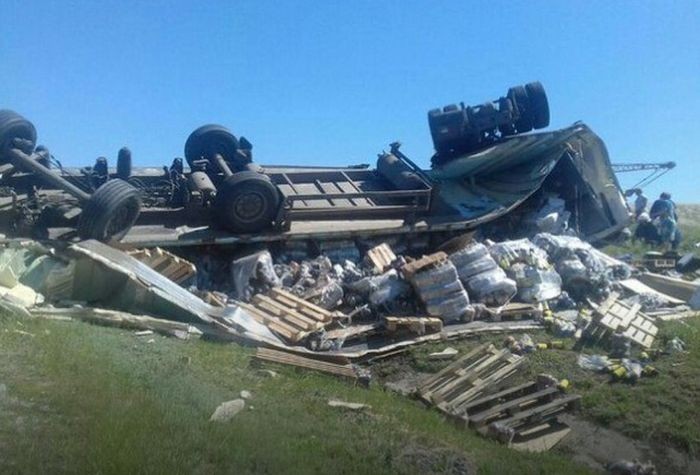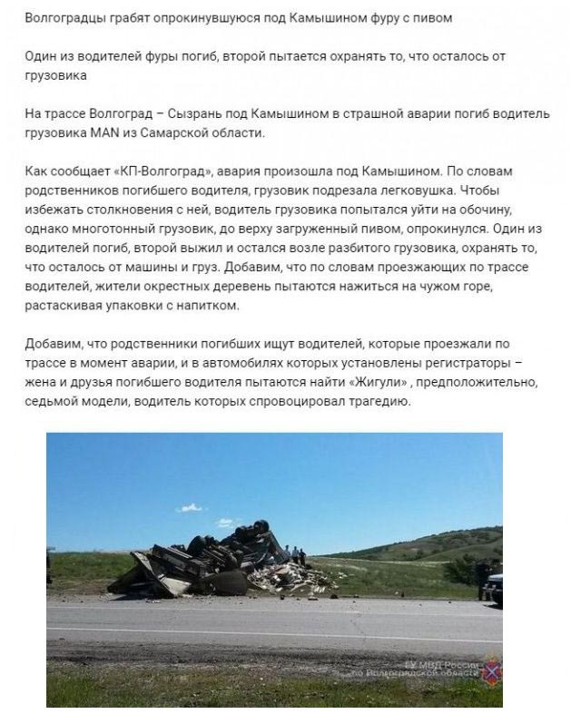 Родственники и друзья дальнобойщиков, попавших в ДТП под городом Камышин в Волгоградской области, попросили пользователей сети помочь одному из выживших водителей. Однако желающих откликнуться на призыв о помощи оказалось не так много, зато желающие нажиться на чужом горе и попить халявного пива, которое перевозил опрокинувшийся грузовик, нашлись очень быстро.
