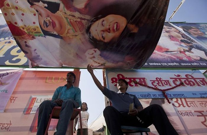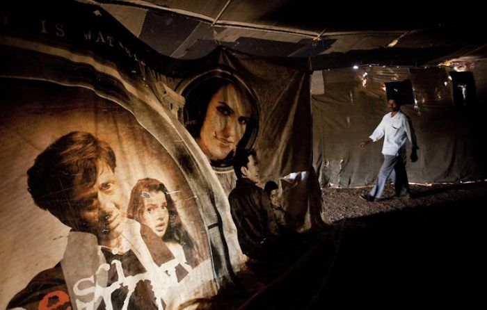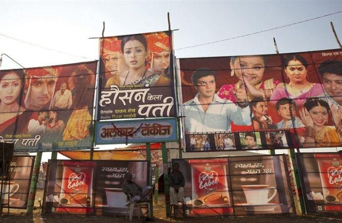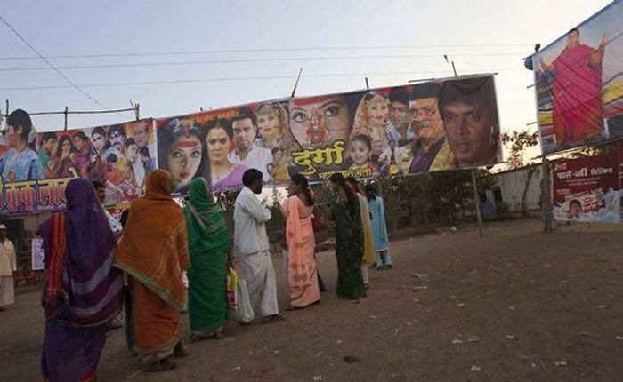 Рядом с кинотеатром устанавливаются палатки и огромные плакаты с лицами звезд Болливуда.